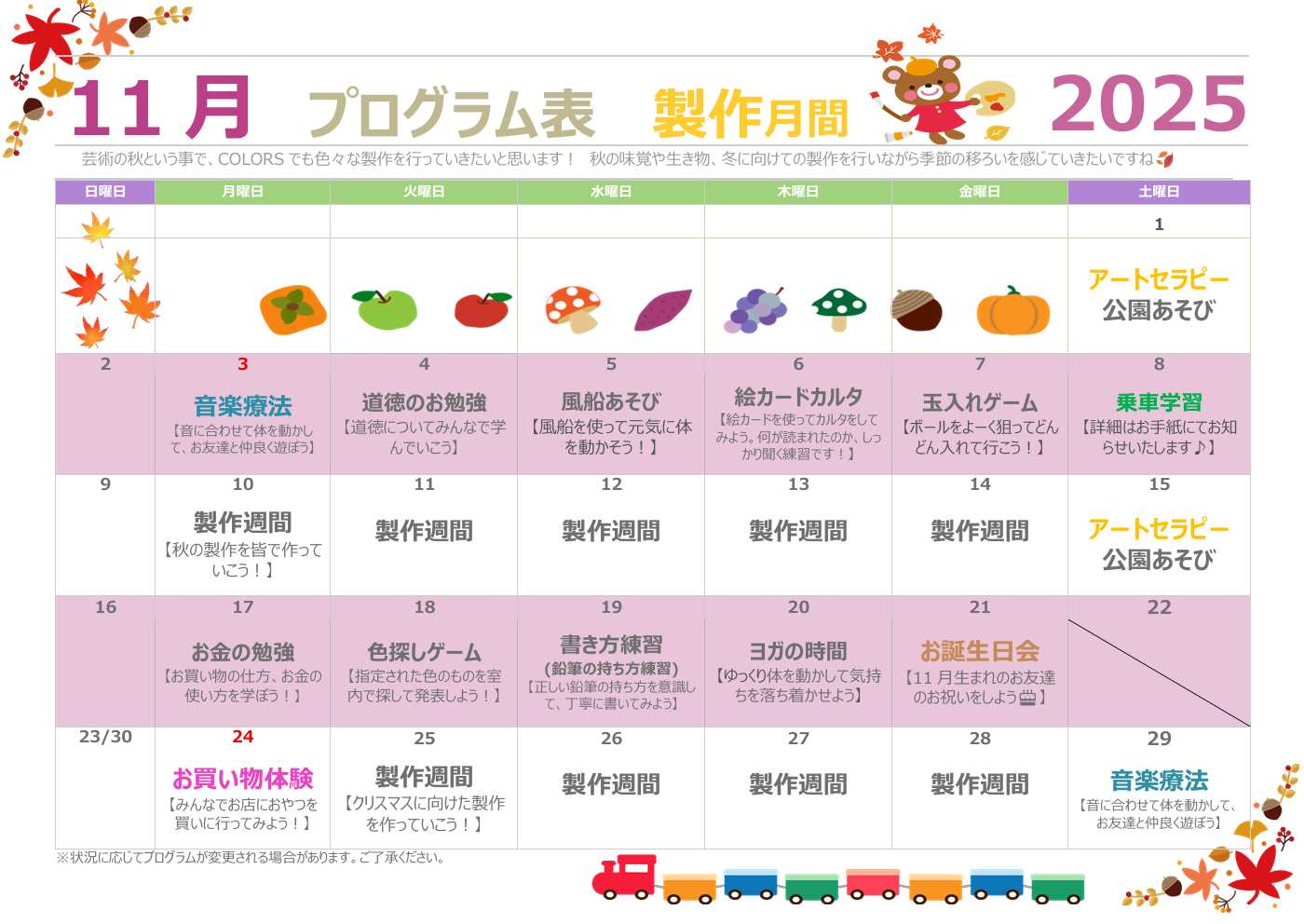 秋の収穫物や生き物、冬に向けての製作などを行いながら手先を使って細かい動きの練習を行っていこうと思います。