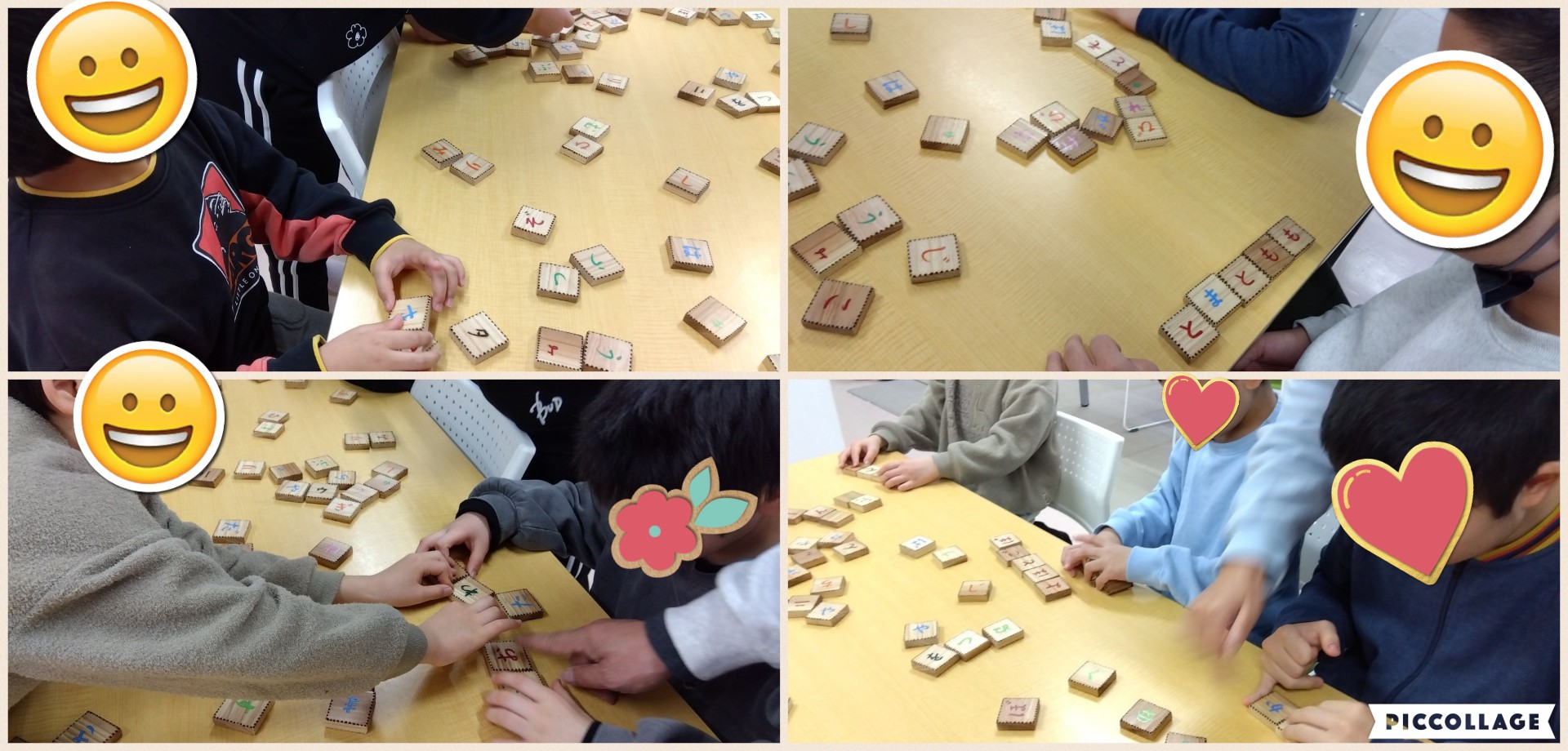 ひらがなが印字された積み木を並べたり、組み合わせたりしながら、一文字ずつじっくり確認する子、言葉を作ろうと挑戦する子など、